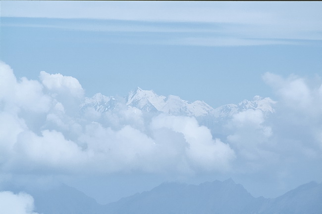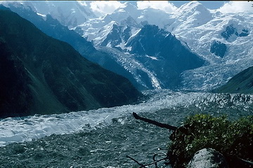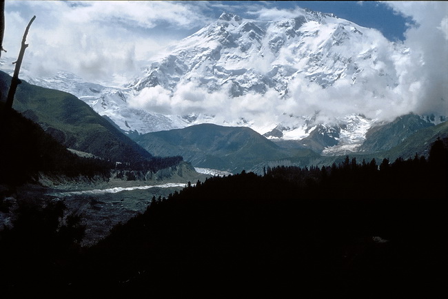 Überdimensional wirkt der Nanga Parbat welcher die Märchenwiese um fast 5000 m überragt. Leider war er im August 2007 kaum zu sehen, so dass wir den alten Film von 1981 einscannen mussten. Der Hügel hinter der Biegung des Rakhiotgletschers hat fast Mt. Blanc Höhe. Dort ist auch der Platz für das Basislager der Nanga Parbat Expeditionen. Auch 1981 war der Himmel oft wolkenverhangen. Die besten Blicke gab es am frühen Morgen.