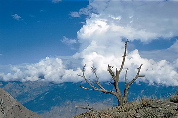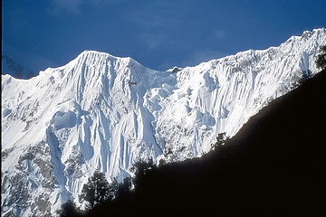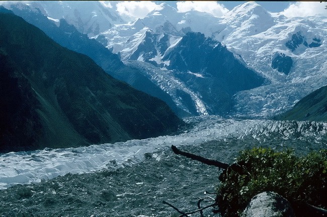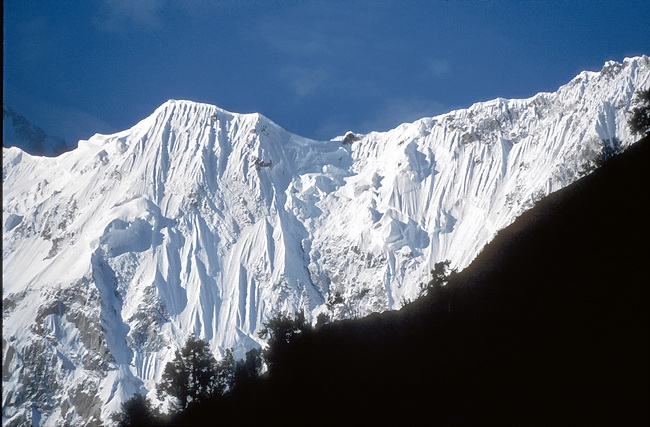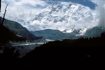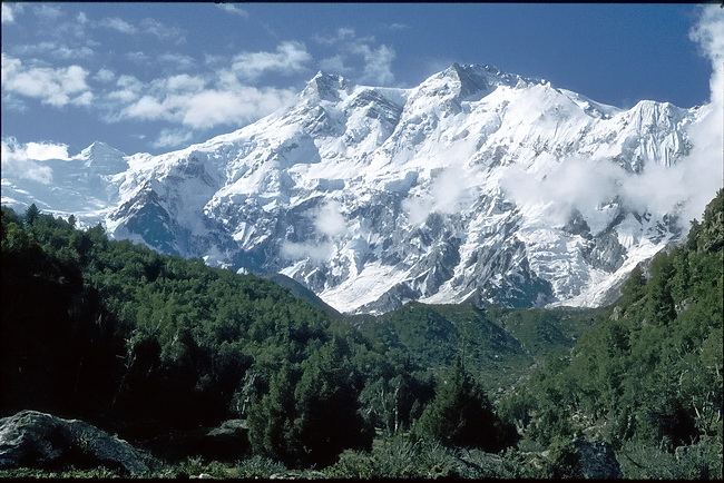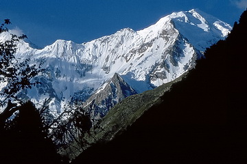 An overwhelming view of Nanga Parbat which is rising nearly 5.000 m above the Fairy Meadows. Unfortunately the weather was too bad in August 2007 so we had to scan some old photos of 1981. The base camp of the Nanga Parbat expeditions is situated on the hill behind the bend of the Rakhiot Glacier at approximately Mont Blanc altitude. Also in 1981 the sky was often overcasted and the best time to take shots was in the early morning hours.