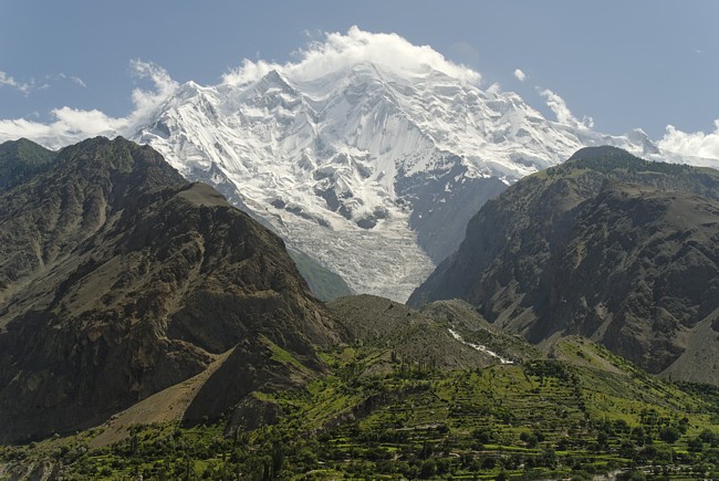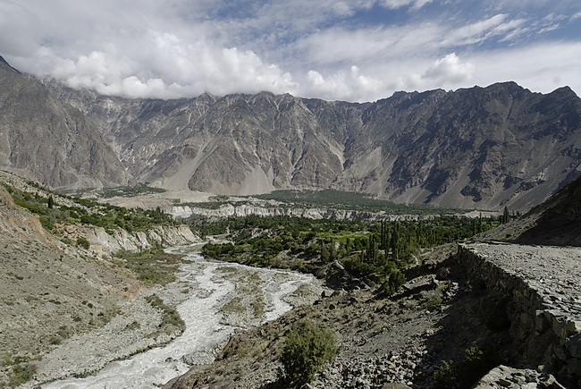Blick ins Hunzatal auf die grüne Oase von Nasirabad. Der Gipfel im Hintergrund ist 'nur' 4544 m hoch und heisst Hachindar. Getrocknete Aprikosen sollen ein Geheimnis für das gesunde und lange Leben der Einwohner des Hunzatales sein.