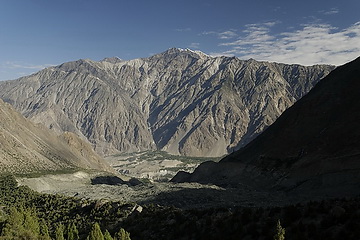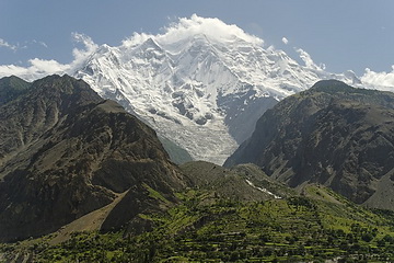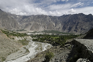 View of the Hunza Valley and the green Oasis of Nasirabad. The summit behind is 'only' 4544 m high and called Hachindar. Dried apricots are supposed to be one of the secrets for the long and healthy life of the inhabitants of Hunza Valley.