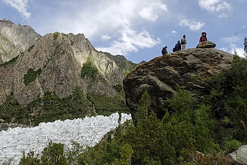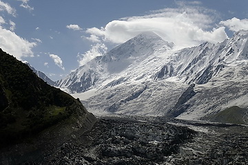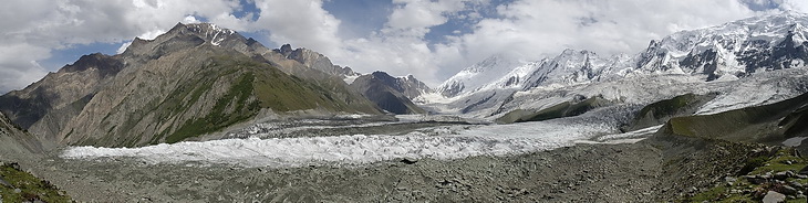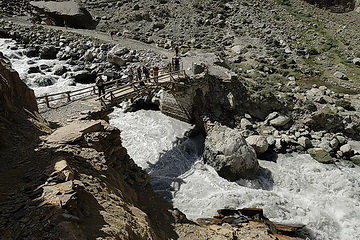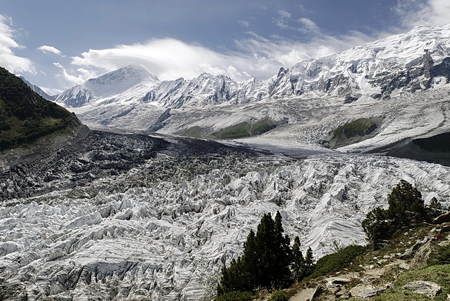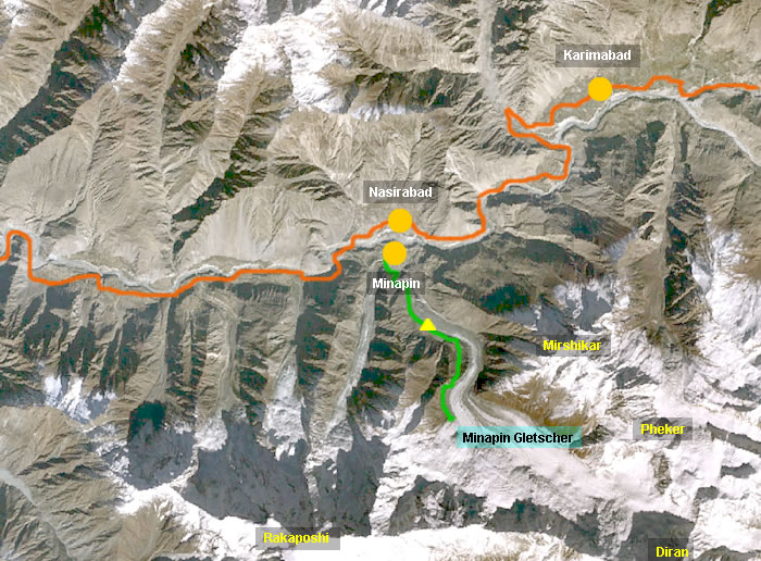 The tongue of the 18 km Minapin Glacier is situated at an altitude of around 2500 m which is very common for the western Karakoram. In the eastern part the glaciers are ending already 2000 m higher due to the aride climate of this area.