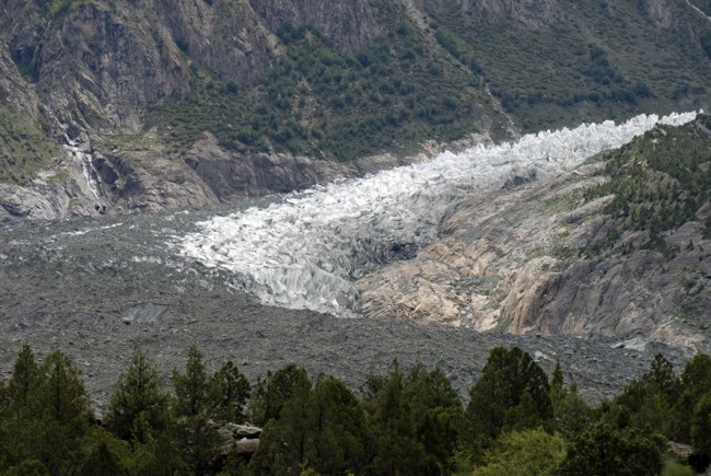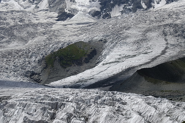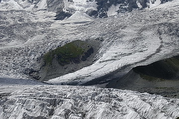 Hier kann man schön beobachten, wie die verschiedenen Mittelmoränen eines Gletscher entstehen. In this picture one can easily see how the different central moraines of a glacier are formed. |