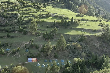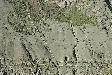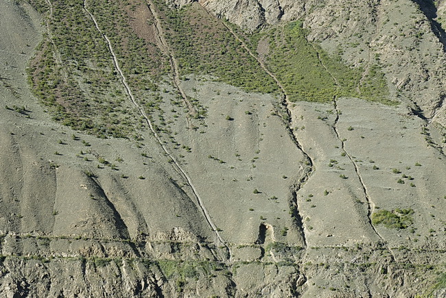 At altitudes of around 3000 m the scenery has an alpine character with green meadows and coniferous forest. The parallel lines are special plumbings which are common in the Hunza Valley. The water is transported from the glaciers down to the valley and distributed according to traditional plans.