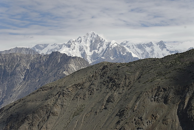 During the descent Shispare (7611 m) the second highest peak in the 32 km wall of the Batura Muztagh appears. The Ultar Massive with Bojohagur Duanasir (7318 m - center) and Ultar Peak (7350 m - right of it) are the eastmost summits of the Batura Range. Shispare on the left side is still hidden by clouds.