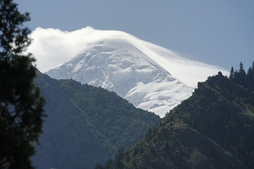 Über das Hunzatal hinweg geht der Blick nach Norden zum Sangemar Sar – 7050 m in älteren Karten, 6950 m bzw. 6990 m in neueren Karten und 6962 m in Google Earth. Rechts vom Sangemar Sar der Pasu Sar (7493 m ) mit dem Felsgipfel des Pasu Diar (7284 m - ganz rechts) sowie Batura I (7785 m - links in Wolken). Rechts ausserhalb des Bildes folgen Shispare und Ultar Peak.