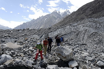 On the next morning the first thing to do was to cross the debris-covered Pasu Glacier. Parts of the 1 km crossing of the Pasu Glacier are quite arduous to go without crampons.