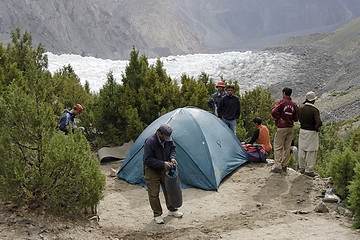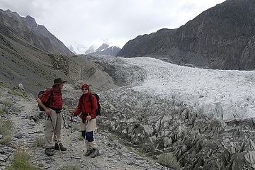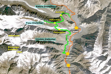 Der Patundasrücken ist ein Lagerplatz der Extraklasse hoch über dem viertlängsten Gletscher des Karakorum. Die Tour führt zunächst vorbei an Ghulkingletscher und Borith See zum Lagerplatz auf der Seitenmoräne des Pasugletschers, welcher am folgenden Tag gequert wird. Nach einem steilen Anstieg über 900 Höhenmeter erreicht man den Patundasrücken zwischen Pasu- und Baturagletscher. Wandert man den Rücken entlang, ergeben sich immer wieder faszinierende Ausblicke, wenn das Wetter mitspielt. Über steile und teilweise ausgesetzte Hänge mit Schiefergeröll geht es dann wieder hinab nach Junzbin (2900 m), unserem letzten Zeltlager, von wo aus man in ca. 2 Stunden den Karakorum Highway ereicht.