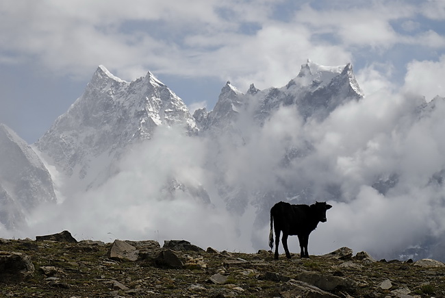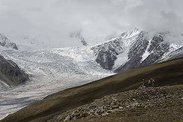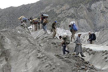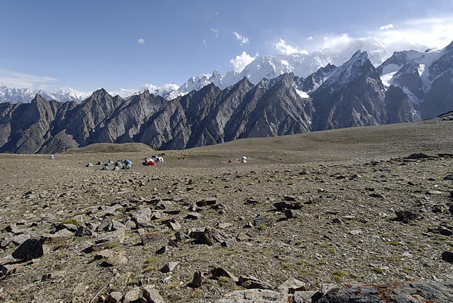 The Patundas Ridge is a very special campsite high above the fourth longest glacier of the Karakoram Range. On the first part of the hike we passed Ghulkin Glacier and Borith Lake and erceted the camp on the moraine of the Pasu Glacier which we traversed the next day. After a steep ascent of about 900 m we reached the Patundas Ridge, an excellent panorama place between Pasu- and Batura Glacier. A walk along the ridge to a panorama point at 4300 m turned out to be a foggy experience but should be very impressive on clear days. Across steep and partly exposed slopes of slate debris we descended to Junzbin (2900) our last campsite from where the Karakoram Highway can be reached in another 2 hours.