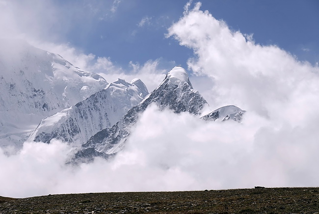 The flat ridge of Patundas is changing abruptely into namless ice peaks: from right to left.: Hiriz (5500m), Darmyani Peak (6095m), Noukarsich (6498m) und Passu East (6842m) in the background.