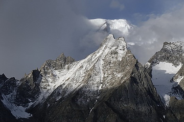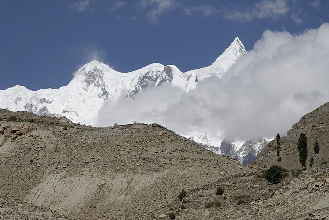 Borchers Peak (6305 m), ein formschöner Gipfel über dem Pasugletscher . Die Schneegrenze liegt hier bei rund 4700 m Höhe.Die Talsohle mit dem Baturagletscher liegt hier etwa 3000 m hoch. Bis zum Karakorum Highway talauswärts sind es noch rund 5 km.Bevor es zum Baturagletscher hinunter geht zeigt sich noch einmal die Pyramide des Shispare (7611m) mit seiner Nordflanke.