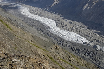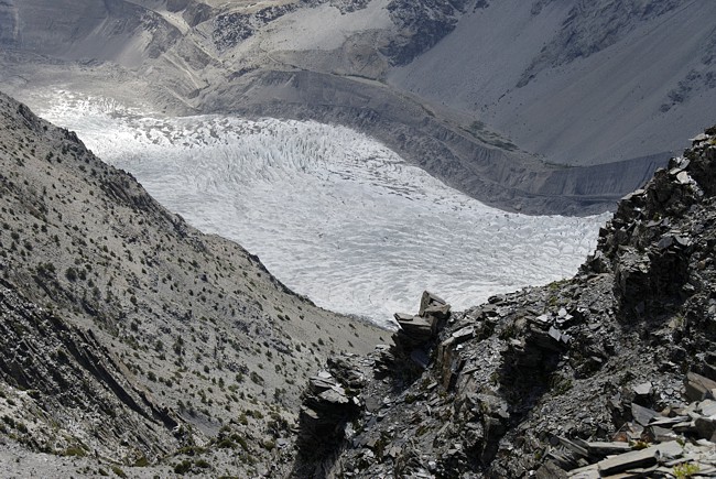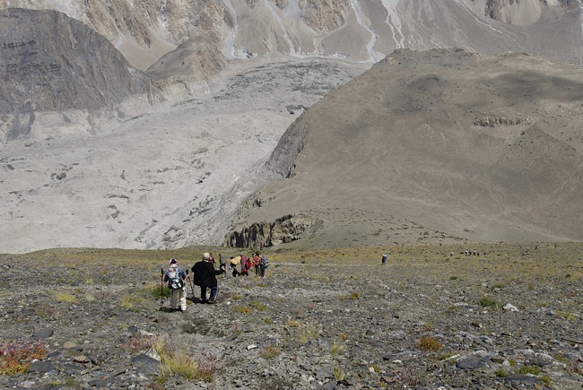 Die nächste Etappe führte uns zunächst auf das schuttbedeckte Eis des Pasugletschers. Die Querung des etwa 1 km breiten Pasugletschers ist ohne Steigeisen stellenweise mühsam.