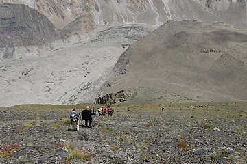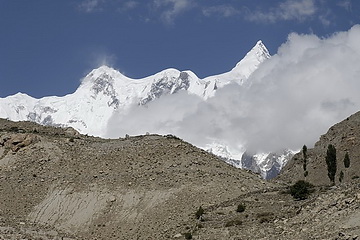 The Batura Glacier is situated at an altitude of 3000 m. From there it is still 5 km to go to reach the Karakoram Highway. Before descending to the Batura Glacier we had a quick view of Shispare (7611m) and its north face.