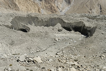 Gletschertor des Baturagletschers. Nach Aufbruch aus dem letzten Zeltlager sind es noch sind es einige Kilometer bis zur Strasse.
