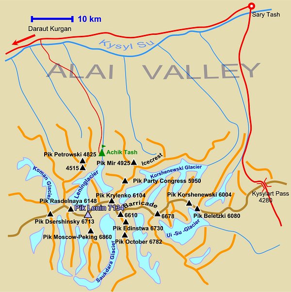 Ausgangspunkt der meisten bergsteigerischen Unternehmungen im Pamir ist das Internationale Bergsteigerlager Atschik Tasch am Nordfuss des Pik Lenin, von wo aus man die anderen Lager mit dem Hubschrauber erreicht. Nach Atschik Tash gelangt man entweder in einer 10-stündigen Busfahrt von Osh im Fergana Becken, über den Taldyk Pass (3625 m mit dem ersten Blick auf die Gletschergipfel jenseits des Alaitales) und Sary Tash, oder nach einem 45 minütigem Flug über die Alaikette nach Daraut Kurgan. Das Alaital erstreckt sich schnurgerade in Ost-West-Richtung, flankiert von der Alaikette im Norden und der Transalaikette im Süden. Wie eine Mauer aus Eis staffeln sich die Gipfel der Transalaikette mit dem Pik Lenin (7134 m) und dem Pik Dsershinsky (6713 m) bis zum Horizont.
