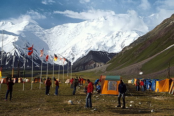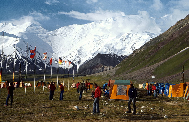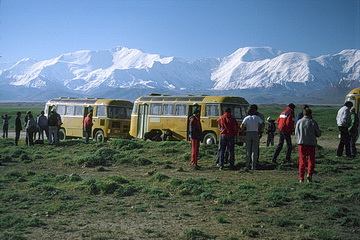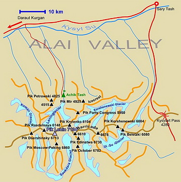 Starting point for most summit climbs in the Pamirs is the International Mountaineers' Camp Atschik Tash (3600 m) at the north foot of Pik Lenin, from where the other camps can be reached by helicopter. One can get there from Osh Airport in the Fergana Basin either by a 10 hours' bus ride via Taldyk Pass (3615 m, where you have the first glimpses of the glacier peaks beyond the Alai Valley) and Sary Tash, or by a 45 minutes' flight in small jet planes across the Alai Mountains to Daraut Kurgan. The Alai Valley, a treeless prairie 3000 m above sea level, extends straightly in east-west direction to a distance of nearly 100 miles, between the Alai Mountains to the north and the Transalai Range in the south. Like a wall of ice the peaks of the Transalai Range file one after another up to the horizon, centered by Pik Lenin (7134 m) and Pik Dsershinsky (6713 m).