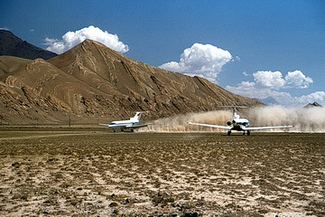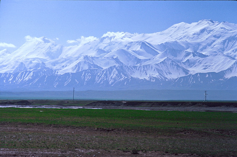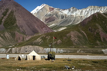 The flight from Osh (if you are lucky enough to get one) takes about 45 minutes and ends at the 'steppe-airport' of Daraut Kurgan (2470 m). About halfway between Daraut Kurgan and Sary Tash a bumpy road leads to the Atschik Tash Camp about 25 km away. For the first time Pik Lenin (7134 m - left) and Pik Dsershinsky (6713 m) become visible.