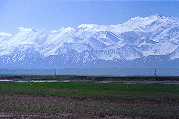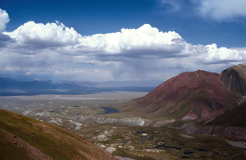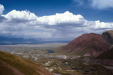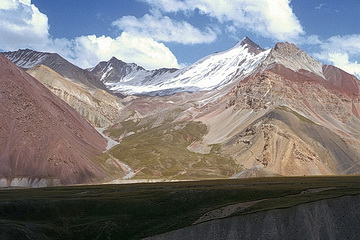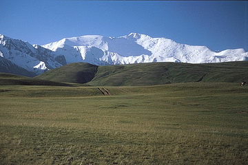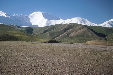 The treeless Alai Valley extends about 150 km in east-western direction at an altitude of 2400 - 3000 m. Arriving from Taldyk Pass (3615 m) the Kurumdy Range (6500 m) dominates the view in south-eastern direction. To the right outside the picture the road continues to Kysylart Pass (4280 m) and Karakul Lake.