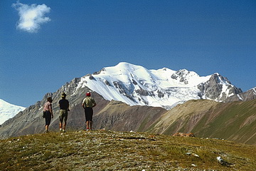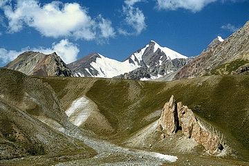 Even in Juli the Pamir mountains are heavily snow-covered like Pik Dsershinsky (6713 m). Numerous rivers find their way down from the glaciers across wide areas of debris. Pik Lenin, the only 7000 m peak of the Transalai Range is dominating the Alai Valley.