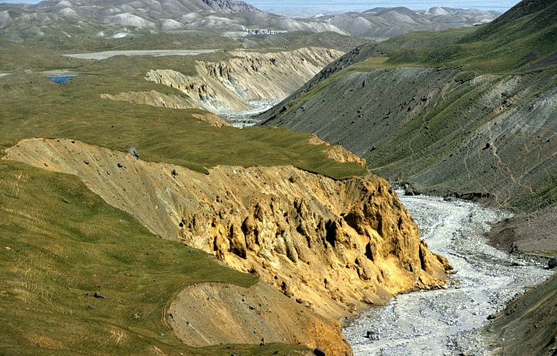 Der Atschik Tash Fluss entwässert den etwa 10 km langen Lenin Gletscher. Im Hintergrund links der Pik 19. Parteitag (5950 m), rechts der Pik Lenin. Nahe dem Atschik Tash Lager fliesst der Atschik Tash Fluss durch einen wilden Canyon mit interessanten Lehmpyramiden.