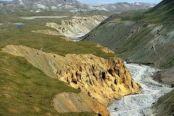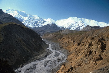 The Atschik Tash River drains the 10 km Lenin Glacier. Behind to the left Peak of the 19th Party Convention (5950 m) and Pik Lenin to the right. Near the camp the Atschik Tash River flows down a canyon with interesting clay pyramids.
