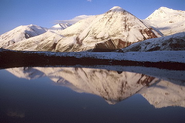 The mountains around the Atschik Tash Camp after another summer snowfall. After the snow melted away the different colours of the folded rock layers become apparent again. To the right Pik Mir (4925 m).