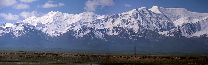 This panorama is taken from the Alai Valley and shows the summits of the Barricade (approximately 6600 m - left) and Pik Edinstwa (6730 m - right). The entire length of this ridge is about 15-20 km.