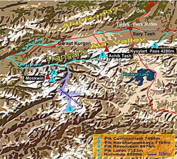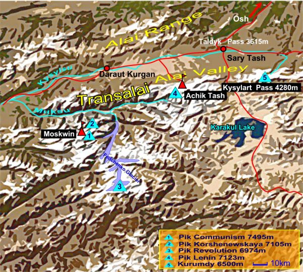 Südlich des Muksu Flusses, der die westliche Transalaikette begrenzt, erheben sich Pik Kommunismus (7495 m) und Pik Korshenewskaya (7105 m) als Knotenpunkte der Peter 1.-Kette in Ost-West-Richtung und der Akademiekette von Nord nach Süd. Ein weiteres Gebirgsmassiv ist der Pik Revolution (6974 m, auch Dreispitz genannt) etwa 50 km südöstlich des Pik Kommunismus. An seiner Nordseite entspringt der Fedchenko Gletscher, mit 77 km der längste ausserpolare Eisstrom der Erde. Das Moskwin Lager am Fuss des Pik Kommunismus (Pik Ismail Samani) ist vom Lager Atschik Tash nur mit dem Hubschrauber zu erreichen.