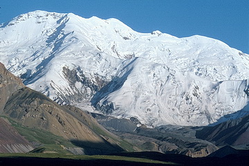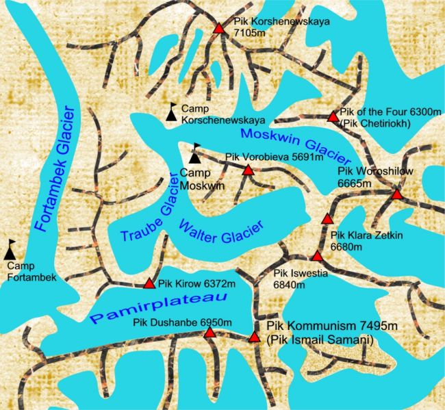 South of the Muksu River - which limits the western Transalai Range - Pik Communism (7495 m - now Pik Ismail Samani) and Pik Korshenewskaya (7105 m) are rising as the crossing points of two mountain ranges: Peter-1st - Range from west to east and Academy of Sciences Range from north to south. Another cumulation point 50 km south east of Communism Peak is Pik Revolution (6974 m) which forms the source of the Fedchenko Glacier, the longest ice stream in non-polar regions, about 77 km long. The Moskwin Camp at the foot of Pik Communism (Pik Ismail Samani) can only be reached by helicopter.
