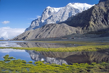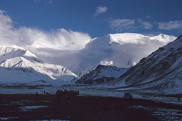 The Atschik Tasch Camp, a small tent village at the foot of Pik Lenin (7034 m - right behind) is the basis for most alpine undertakings in the Pamir area. The camp is reached by small offroad busses. Even in summer snowfalls are not unusual at an altitude of 3700 m.