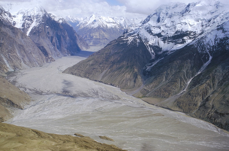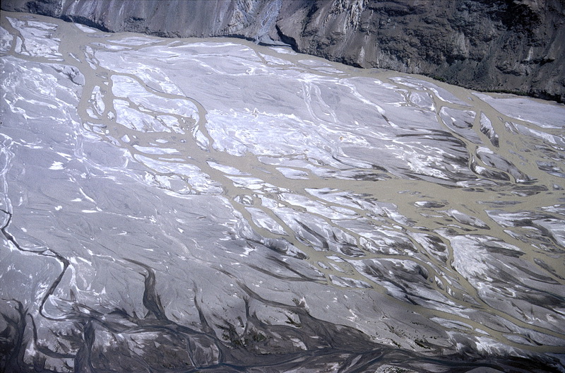 The easiest way to reach the Moswin Camp below Pik Communism as well as the Fortambek Camp at the foot of Pik Korshenewskaya is by helicopter. The flight leads along the 5000 m peaks of the western Transalai Range behind which Pik Communism is situated and across the valley of Muksu River which drains the Fedchenko Glacier. About 77 km long covering an area of 900 square kilometers the Fedchenko Glacier is the largest non-polar glacier on earth. A detailed view of the Muksu River shows why helicopters are necessary to get to the Pamir camps.