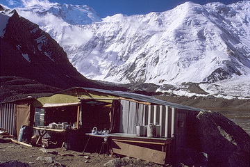 The kitchen of the Moskwin Camp at an altitude of 4400 m with the 2000 m Borotkin Pillar in the background which marks the shortest and 'easiest' ascent to Pik Communism. After crossing the Pamir Ice Plateau (6000 m - behind the ice wall) which is about 10 km long and 2 km wide Pik Dushanbe (summit in the background to the right - 6950 m) has to be climbed on the ascent route to Pik Communism.