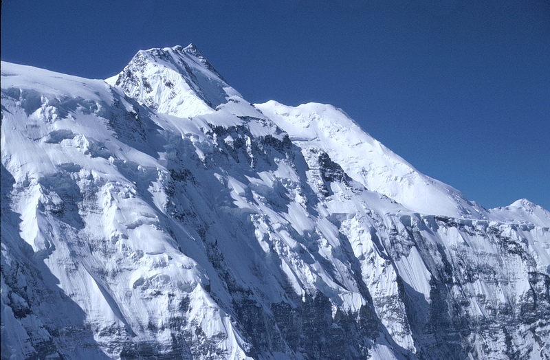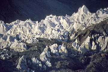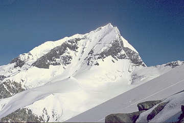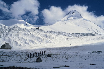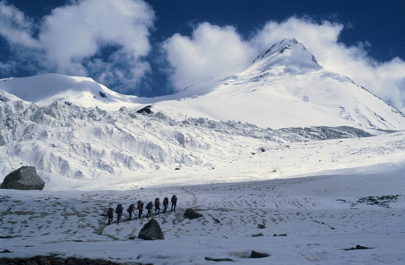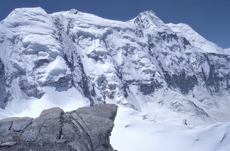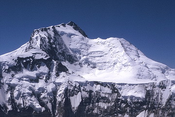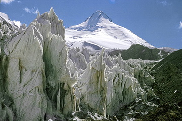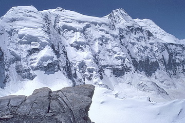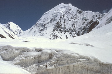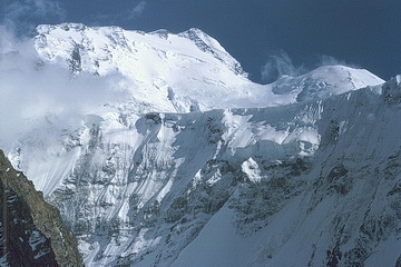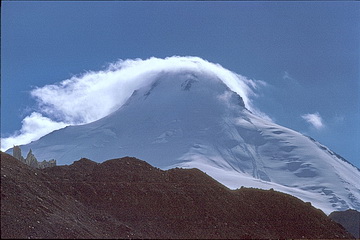 Peak of the Four (6300 m) seen from the southern side-moraine above Moskwin Camp. The ascent route leads up the south ridge to the right. The summit cloud is due to the elevation of humid air which leads to condensation and is dispersed again after sinking down behind the summit.