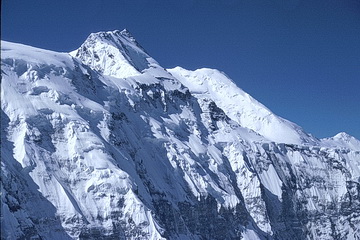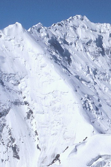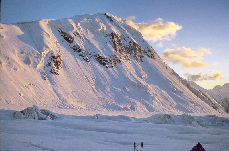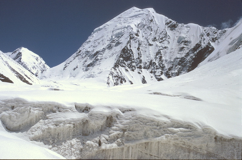 South face of Pik Korshenewskaya (7105 m). In the foreground the moderately steep snow slope which leads to the summit of Pik of the Four.