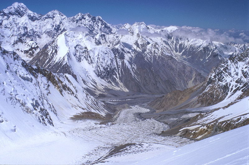 Blick vom Gipfel des Pik der Vier nach Westen auf den Moskwin Gletscher. Das Moskwin Lager liegt auf der Felsinsel links etwas oberhalb der Gletscherzunge. Im Hintergrund ganz links der Pik Moskwa (6785 m).
