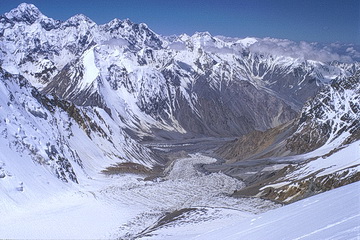 View from the summit down to the Moskwin Glacier. The Moskwin Camp is situated on the rock island left above the glacier tongue. In the background to the left Pik Moskwa (6785 m).