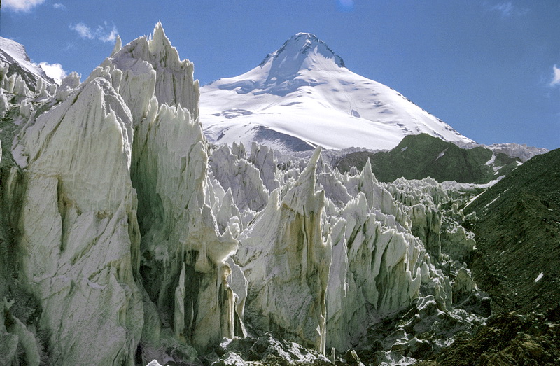 An additional camp on the Moskwin Glacier (5200 m) is necessary to climb Peak of the Four. Behind Pik Klara Zetkin (6665 m). The right image shows Pik MFTI (5691 m, also called Pik Vorobiewa) seen from the intermediate camp below Peak of the Four. While crossing the Moskwin Glacier care should be taken of the seracs above.