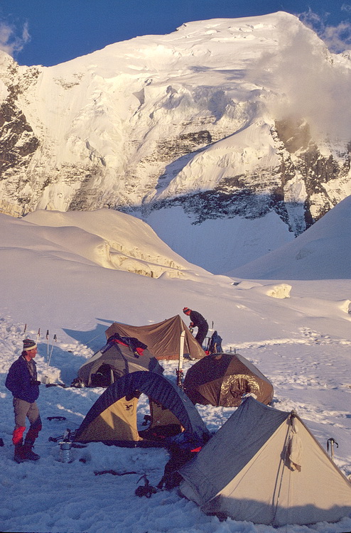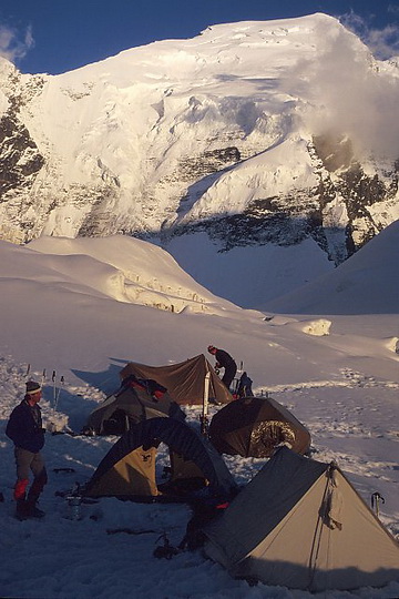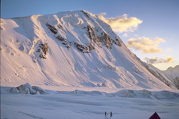 View of the Moskwin Camp in north western direction. In the background Pik Korshenewskaya (7105 m). North of the Moskwin Camp the serac-covered Moskwin Glacier flows down.