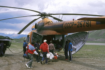 Mit einem Aeroflot Hubschrauber geht es nach wenigen Tagen weiter ins Moskwin Lager am Fusse des Pik Kommunismus oder zum Fortambek Lager am Pik Moskwa, von dem man wiederum das Lager Staubwiese am Pik Korshenewskaya erreicht. Der Helikopterflug führt entlang und über die Fünftausender der westlichen Transalai Kette, hinter der die Akademie Kette mit dem Pik Kommunismus liegt und über das Tal des Muksu Flusses welcher den Fedchenko Gletscher entwässert. Der Fedchenko Gletscher ist mit 77 km Länge und über 900 qkm der längste ausserpolare Gletscher der Erde. Hier wird klar, warum die Lager des Pamir nur mit Hubschraubern erreichbar sind.