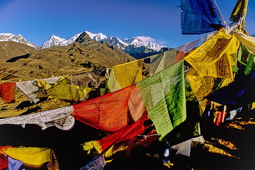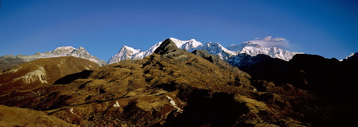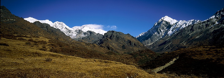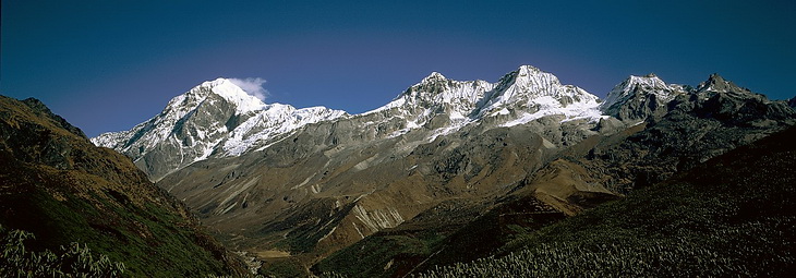 On top of 'Holy Hill' a short way above Dzongri we have a phantastic panorama covering Kabru, Kangchenjunga and Pandim.