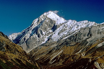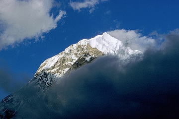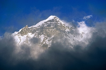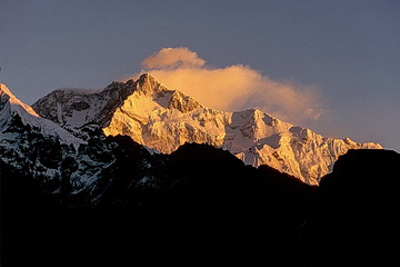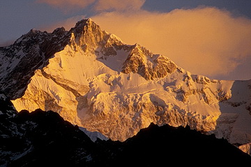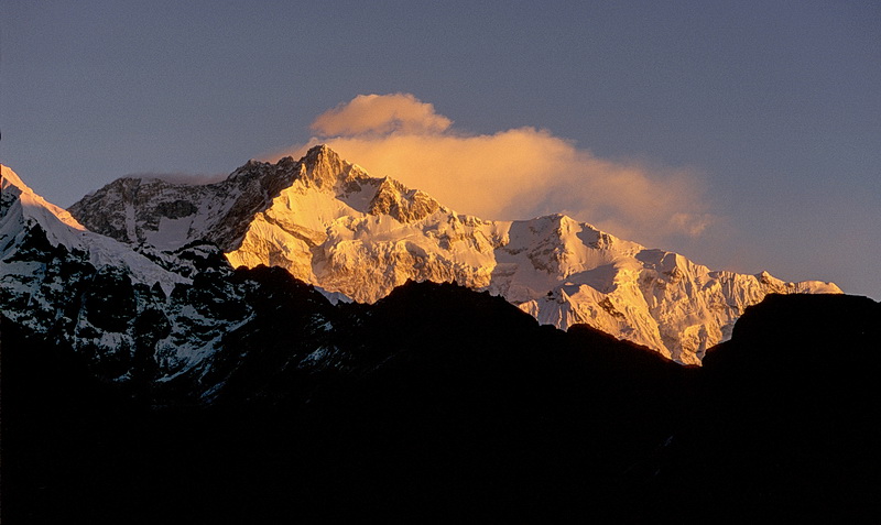 The sunlit south-eastern face of Kangchenjunga south- (8476m) and main summit (8598m - in the shadow to the left).