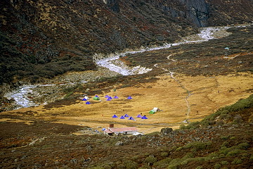 Zwischen Dzongri und Thangsing ist der Pandim (6691m) immer im Blickfeld. Unser Lagerplatz in Thangsing liegt inmitten einer grossartigen Hochgebirgslandschaft auf ca. 3950m.