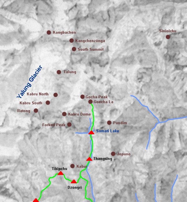 Between Dzongri and Thangsing Pandim (6691m) is the dominating peak. Our campsite at Thangsing at about 3950m is embedded in a phantastic high mountain scenery.