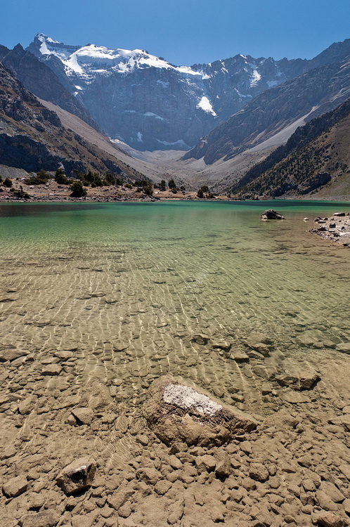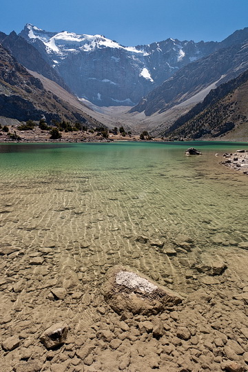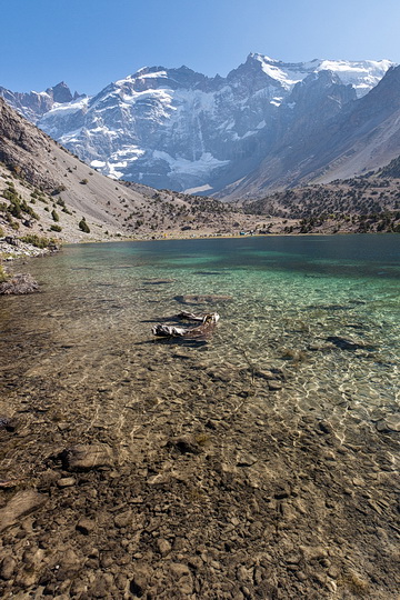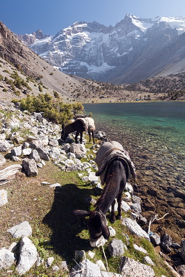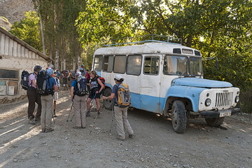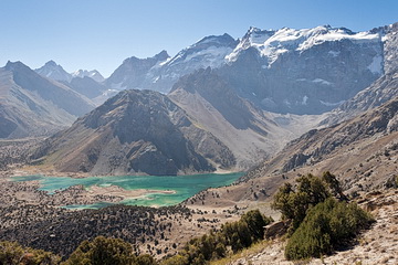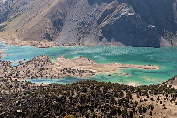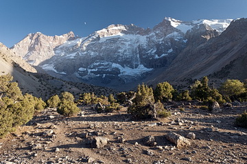 During the next two days we are hikng through the phantastic alpine scenery of the Fan range to the turquois-coloured Chukurak- and Kulikalon lakes. The first pass to cross is Guitan (2.600 m) between Zimtut and the Chukurak lakes. Well acclimatised by now we then traverse the Chukurak pass (3.180 m) on the next day and enjoy an extraordinary view of the north face of Miraly (5.120 m) and peak Maria (4.970 m) high above the Kulikalon lakes.