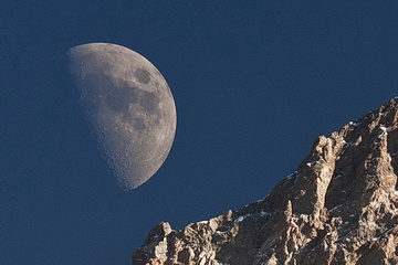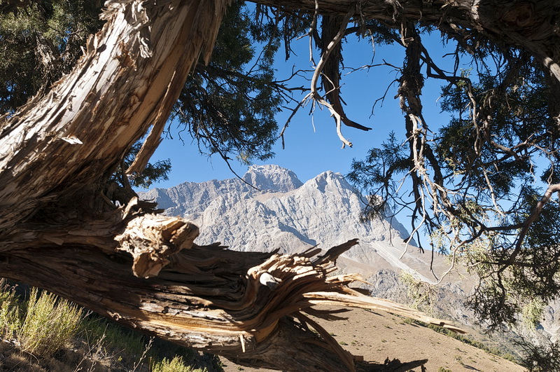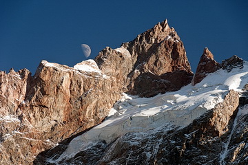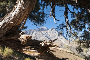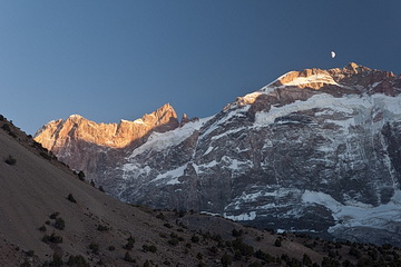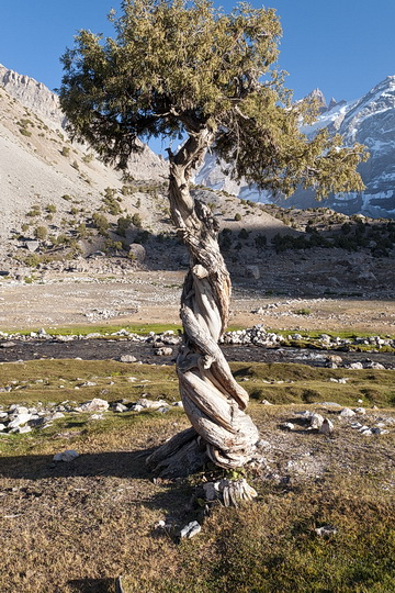 Knorrige Wacholderbäume säumen den Weg entlang des Kulikalonsees und auch der zunehmende Mond über dem Pik Promejutochny (4810 m) zeigt sich in der klaren Luft von seiner besten Seite.