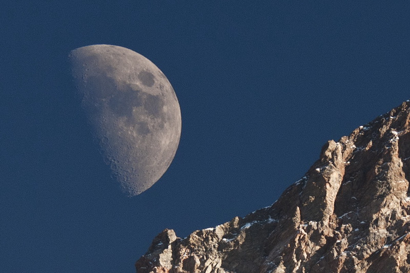 Gnarly Cedars are lining the path along the shore of Lake Kulikalon and even the moon above Pik Promejutochny (4.810 m) shows itself in its best light.