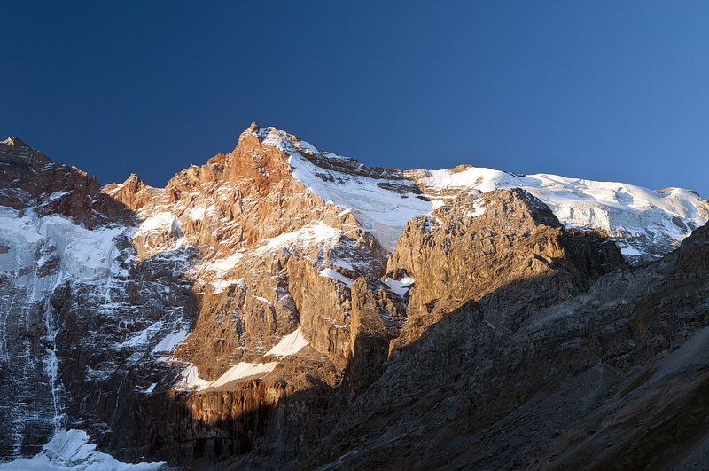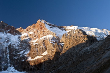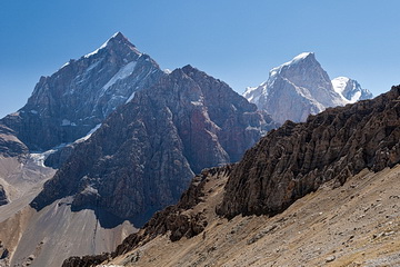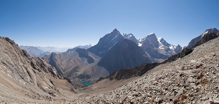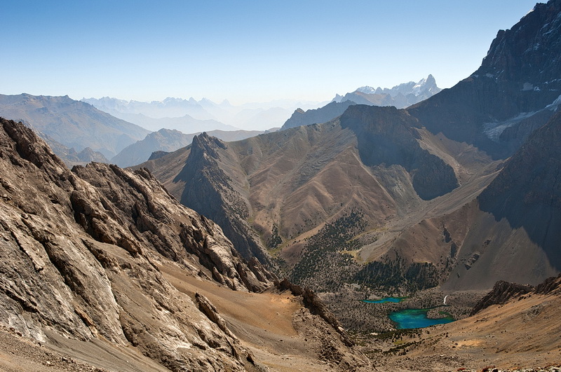 View from the top of Alaudin pass in south-eastern direction down to the Alaudin lakes and the summits of Chapdara (5.050 m), Bodhona (5.138 m), Pik Zamok (5.070 m) and Malaya Ganza (4.956 m). The west-face of Chapdara is nearly 2.000 m high and consists of reef limestone from the Silurian Age.