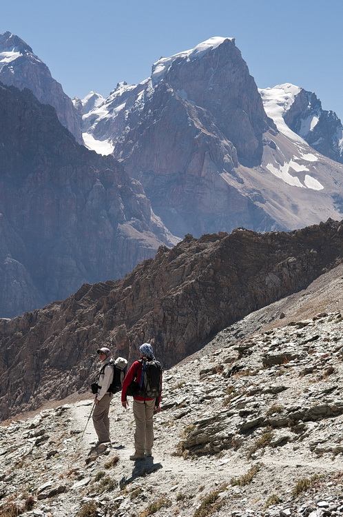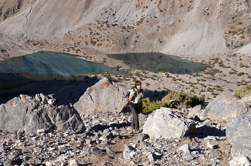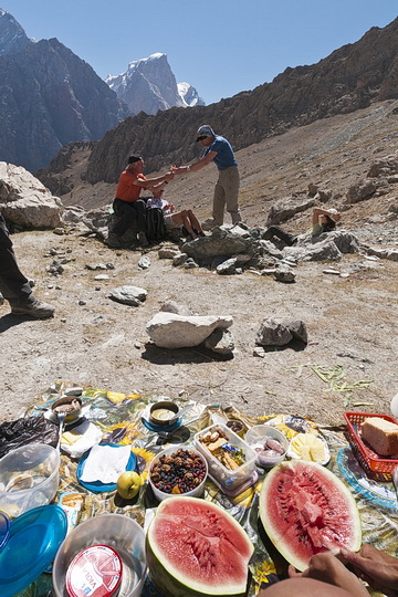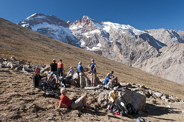 Lunch break on Alaudin pass. Above the Alaudin lakes some of the 4000 m peaks of the eastern Fan range are rising in the background.