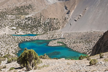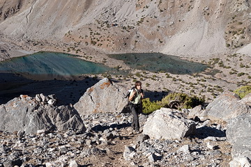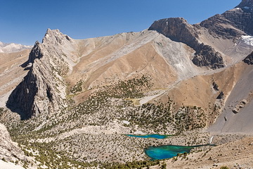 On the sixth day the scenery changes again. From the top of Alaudin pass we have an extraordinary view to the ' 'Dolomites' of the Fan range and the crystal clear lakes below.