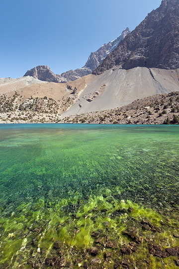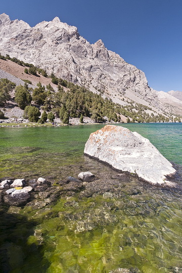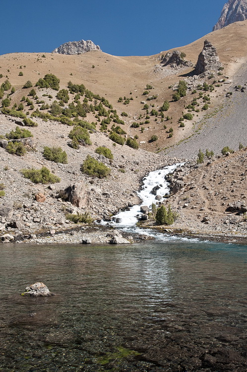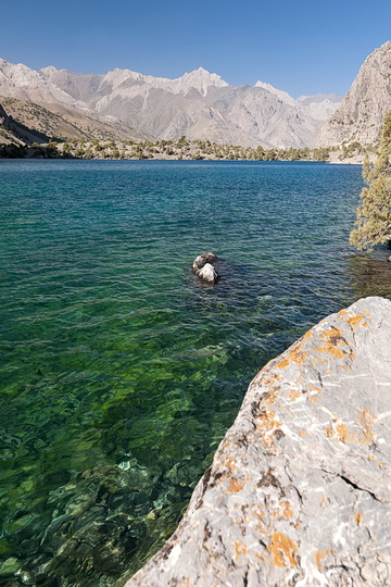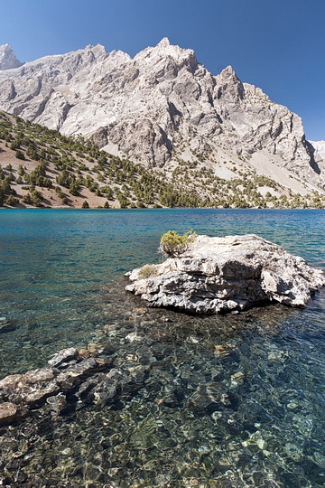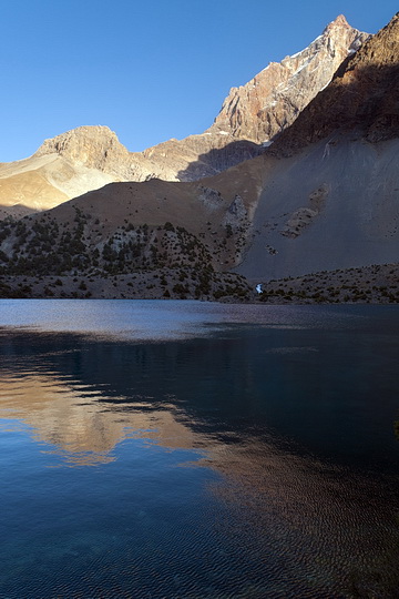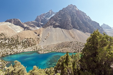 Am sechsten Trekkingtag wechselt abermals die Szenerie. Vom Alaudinpass (3860 m) haben wir einen beein- druckenden Blick auf die Dolomiten des Fangebirges und seine kristallklaren Seen.