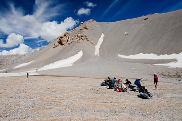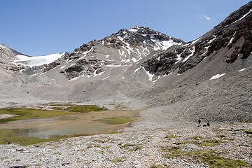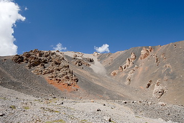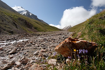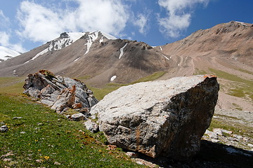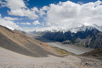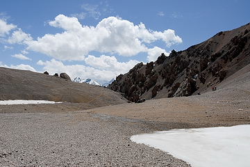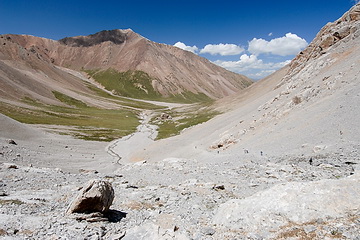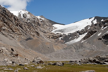 Alpine pastures and scree slopes are dominating the scenery on the way to the Tjuz Pass (4.001 m), the passage to the valley of the Southern Inylcheck glacier.